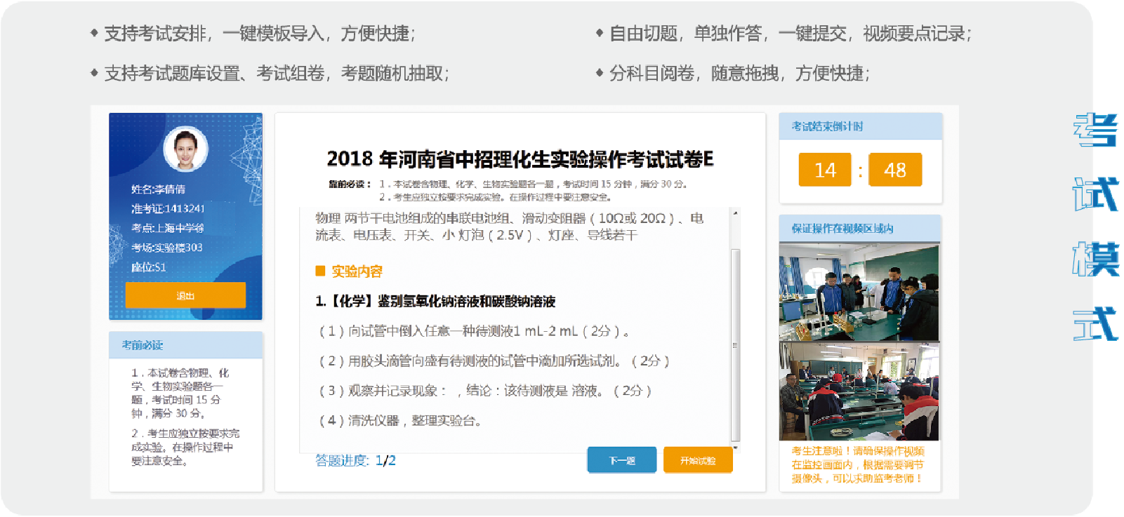 系统智能化装备全过程记录考生实验操作,让考后追溯成为可能。多阅仲裁机制,保证考试阅卷公平公正性。未来智能赋分,依托机器打分排除主观性。可以通过考务系统对整场考试流程进行信息化管理,从准备考试试题到创建考点、安排考场、分配场次、座位抽签都可直接通过系统信息化管理。并有专业的大数据引擎,自动生成科学分析报告,指导教学、教研及课程改革,全面实现整合并制作专业的标准实验视频、海量的标准题库,全版本教材,为用户打造信息化一站式教学资源。同时提供教案共享交流平台,为教师提供再学习的机会,促进教师专业成长。
