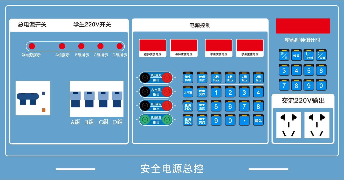 8.学生220V交流电源通过教师电源主控上的学生220V按键直接选取,确认后学生桌上即有电源输出。