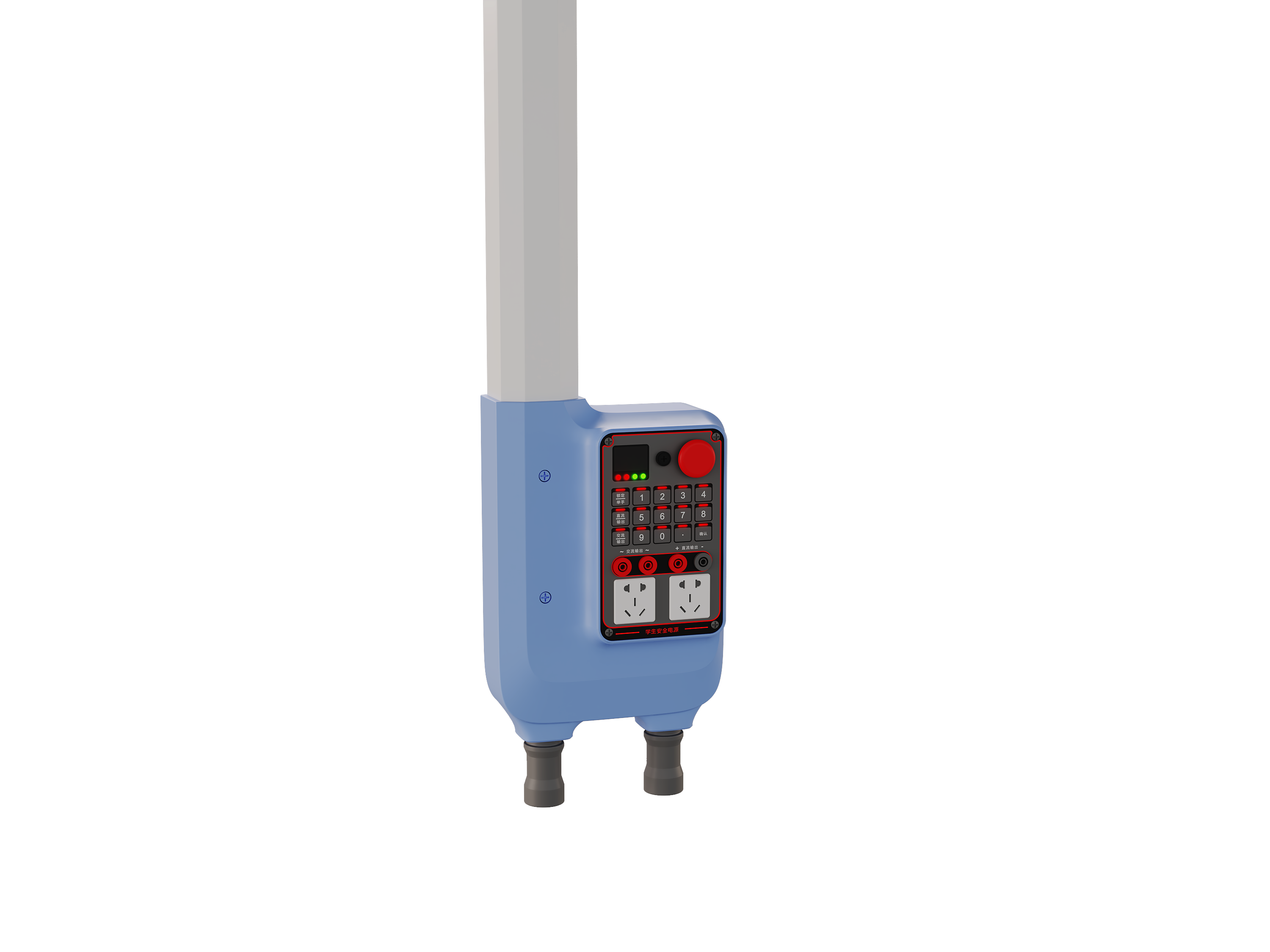 3.操作平台集成LED液晶屏。屏幕显示功能包括220V高压输入状态、AC输入状态、DC输入状态、AC/DC切换状态、锁定状态、警报状态、调节功能等。能显示交直流电压,学生电源既能独立操作,也能接受教师远程控制。支持教师远程控制和锁定功能,锁定状态下学生无法操作设备。